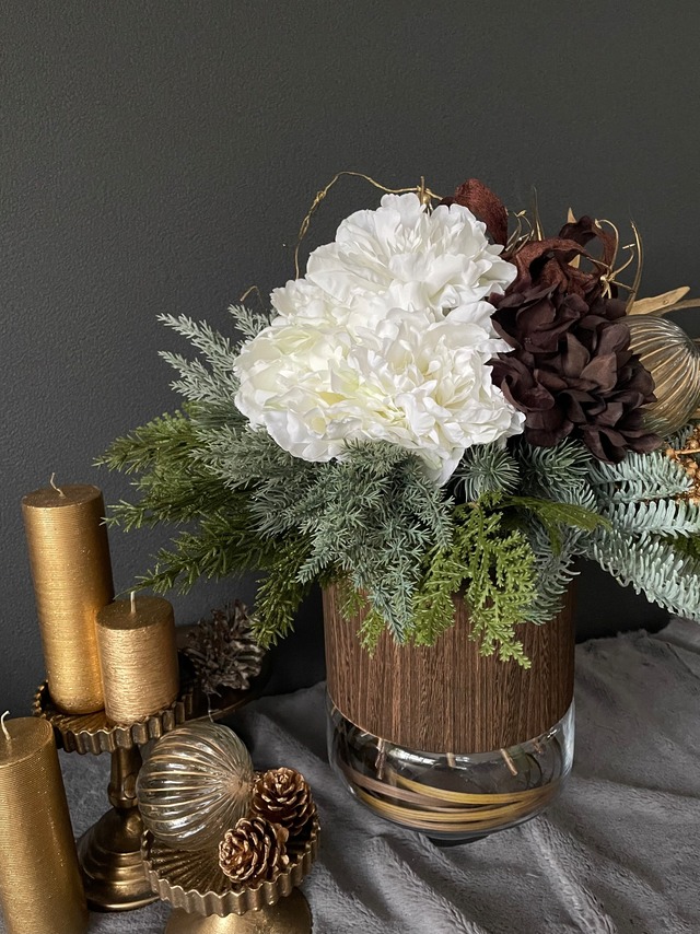 木とガラスのコンビの器に、モミの枝やヒバなど冬のグリーンをたっぷりと使い、シャクヤクをメインにコーディネートしました。 ブラウンのアジサイやグロリアサと、ガラスのラグジュアリーなガラスのオーナメントやマットゴールドの葉っぱや実がシックな華やかさを醸し出します。 【サイズ】幅 約45cm、高さ 約50cm 【アーティフィシャルフラワーとは】 高級感のある美しさと耐久性を併せ持った、布製または樹脂製のお花(造花)です。 水替えなども不要で、お手入れは特に必要ありません。手間がかからず気軽に飾れることが魅力です。 ※照明や日光に長時間当たると色あせすることがございます。 ※初めての方にもわかりやすい取扱説明書をお付けしております。 【お届け日について】 こちらの商品はお手元にお届けするまで1週間程度お日にちを頂戴しております。お急ぎのお客さまは、お電話またはメールにてご相談下さいませ。 電話:0798-41-3683 (平日10:00〜16:00) メール: [email protected] ※材料入荷の都合で、細部が写真と若干異なる場合がございます。その場合も、ベストな代品で全体の雰囲気を損なうことなくお作り致します。ご安心ください。ご購入の際はその点ご了承お願い致します。 ※実店舗と在庫を共有しており、タイミングによっては売り切れの場合があります。その場合は改めてご連絡させて頂きます。