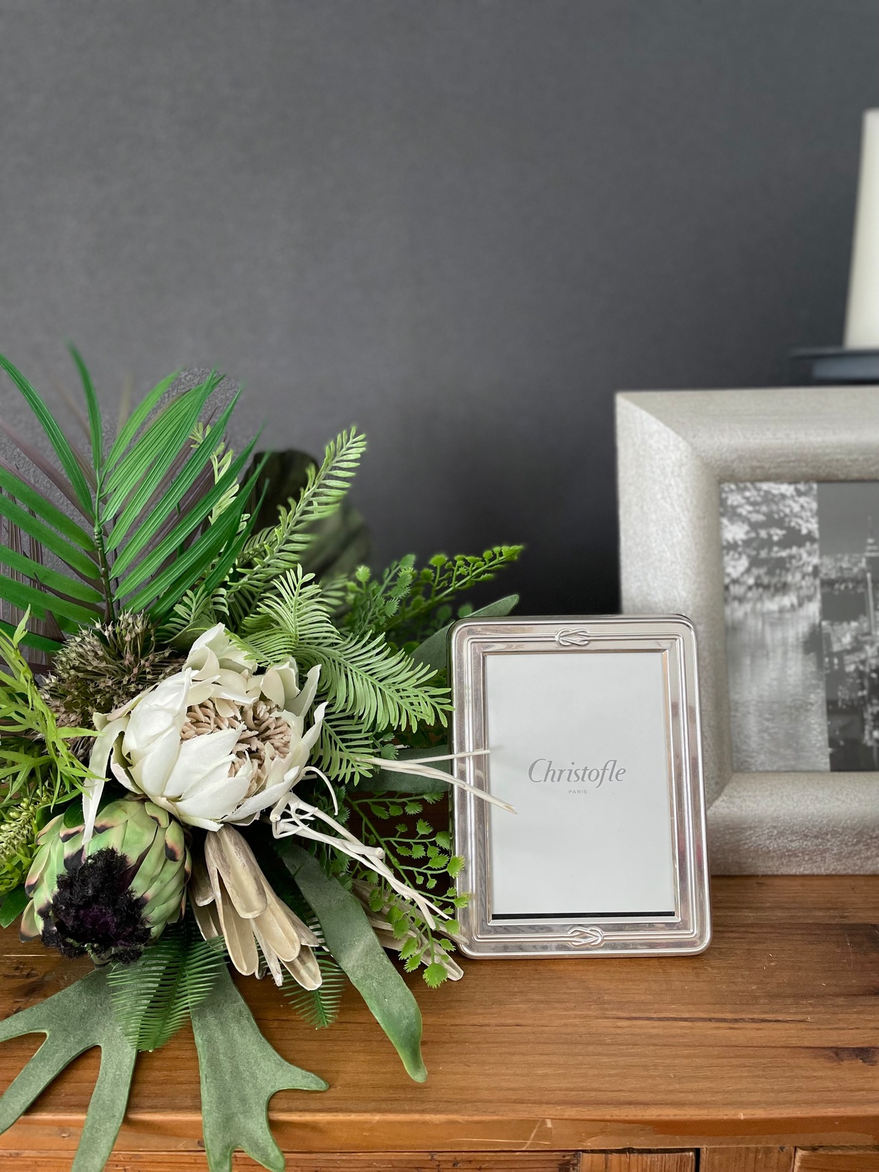 ホワイト&ブラックのプロテアに、様々な種類のグリーンわ、あしらい、モノトーンの器にシンプルにモダンな雰囲気でコーディネートしました。男女問わず人気のアーティフィシャルフラワーアレンジメントです。