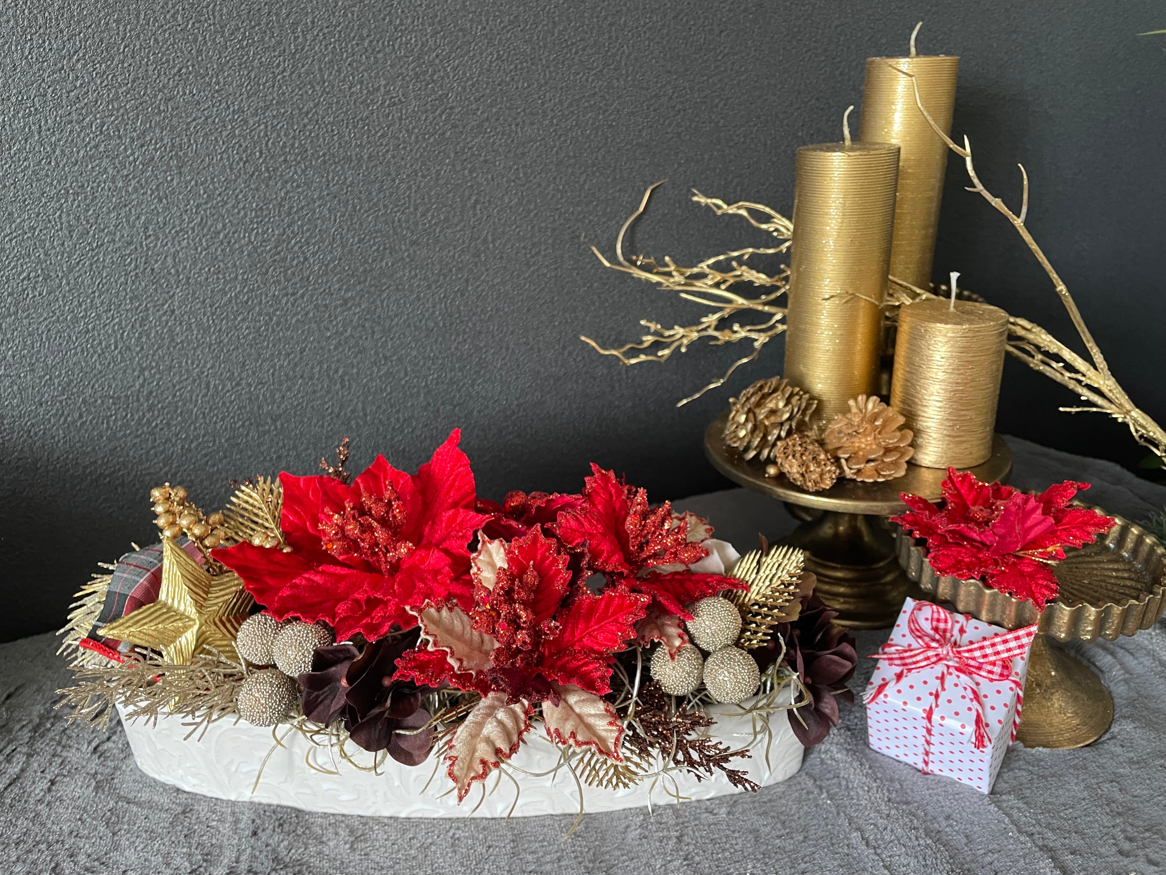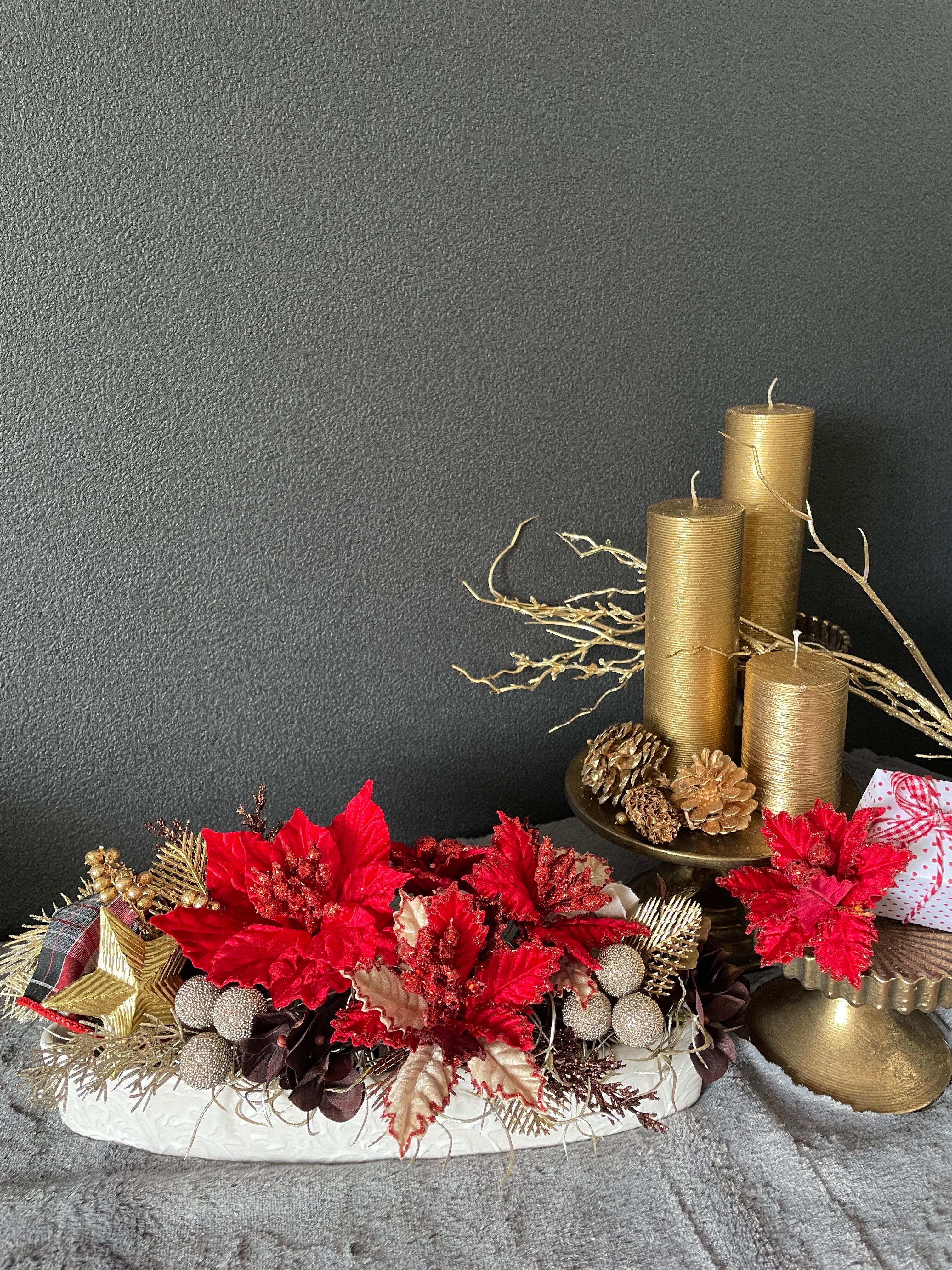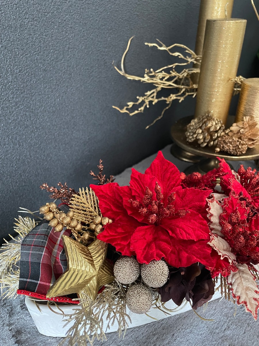 華やかさなベルベットの赤いポインセチアをメインに、クリスマスらしい小物をたくさん散りばめたコンパクトサイズのアレンジメントです。