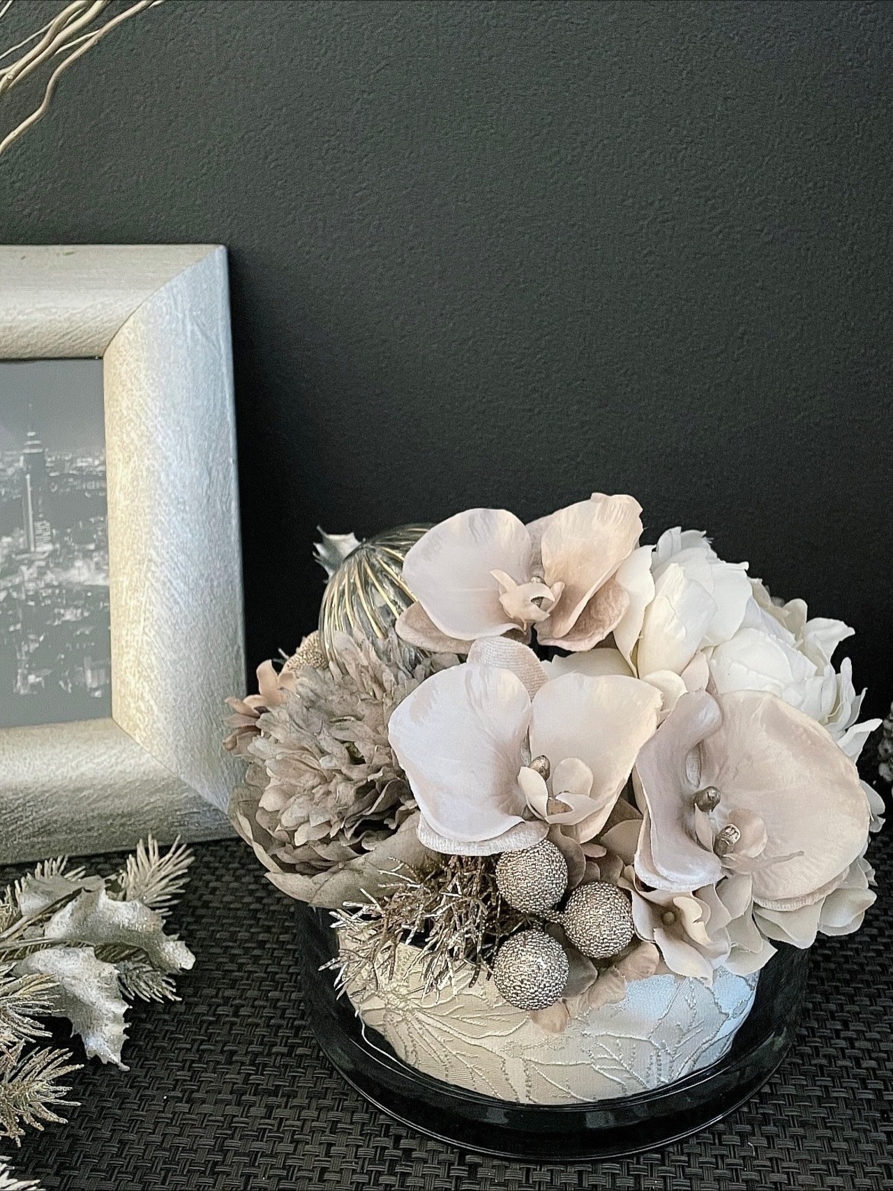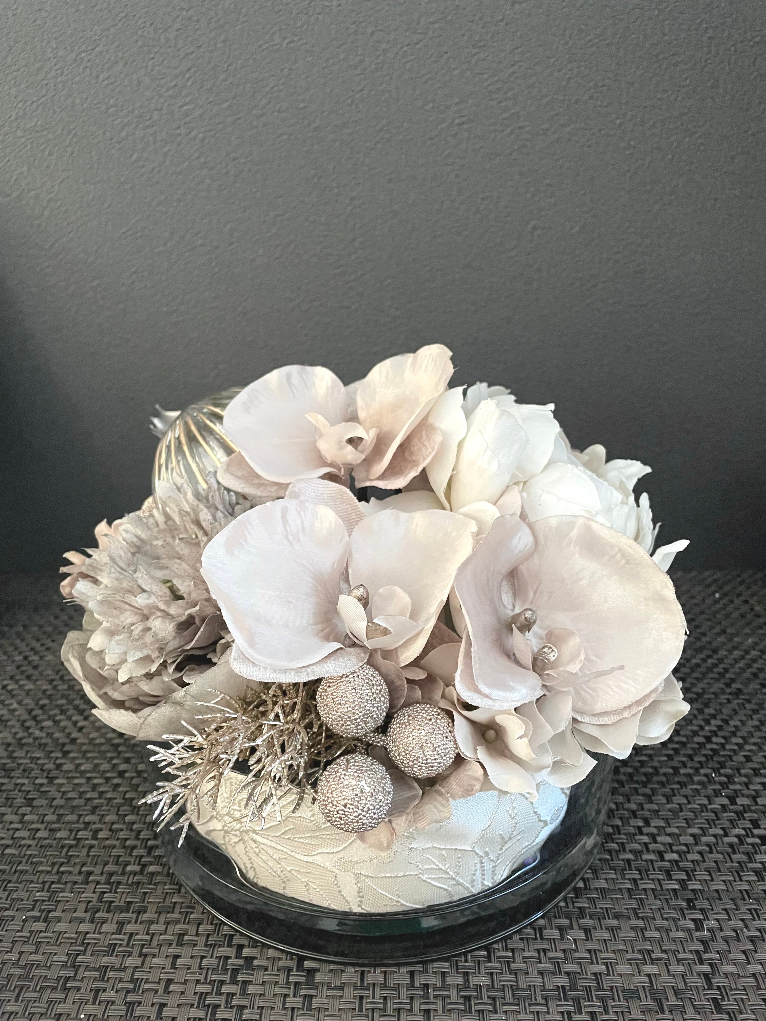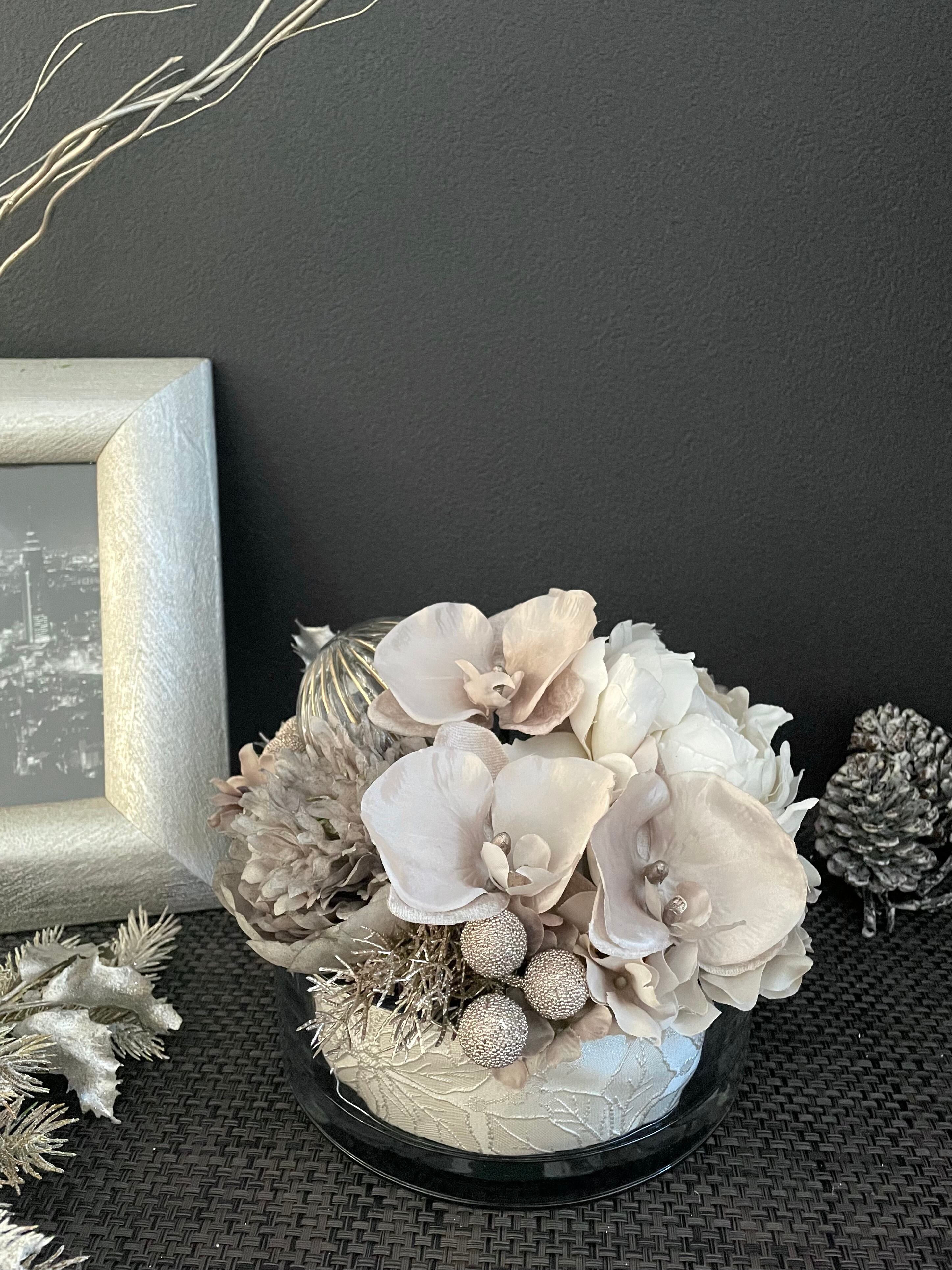 クリスマスアレンジメント シック フラワーアレンジ グレージュ フラワーコーディネート ホワイト ノーブル フラワーアレンジメント クリスマスディスプレイ ノーブル ホワイト