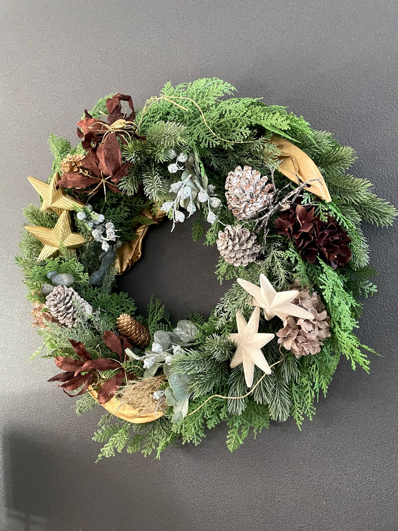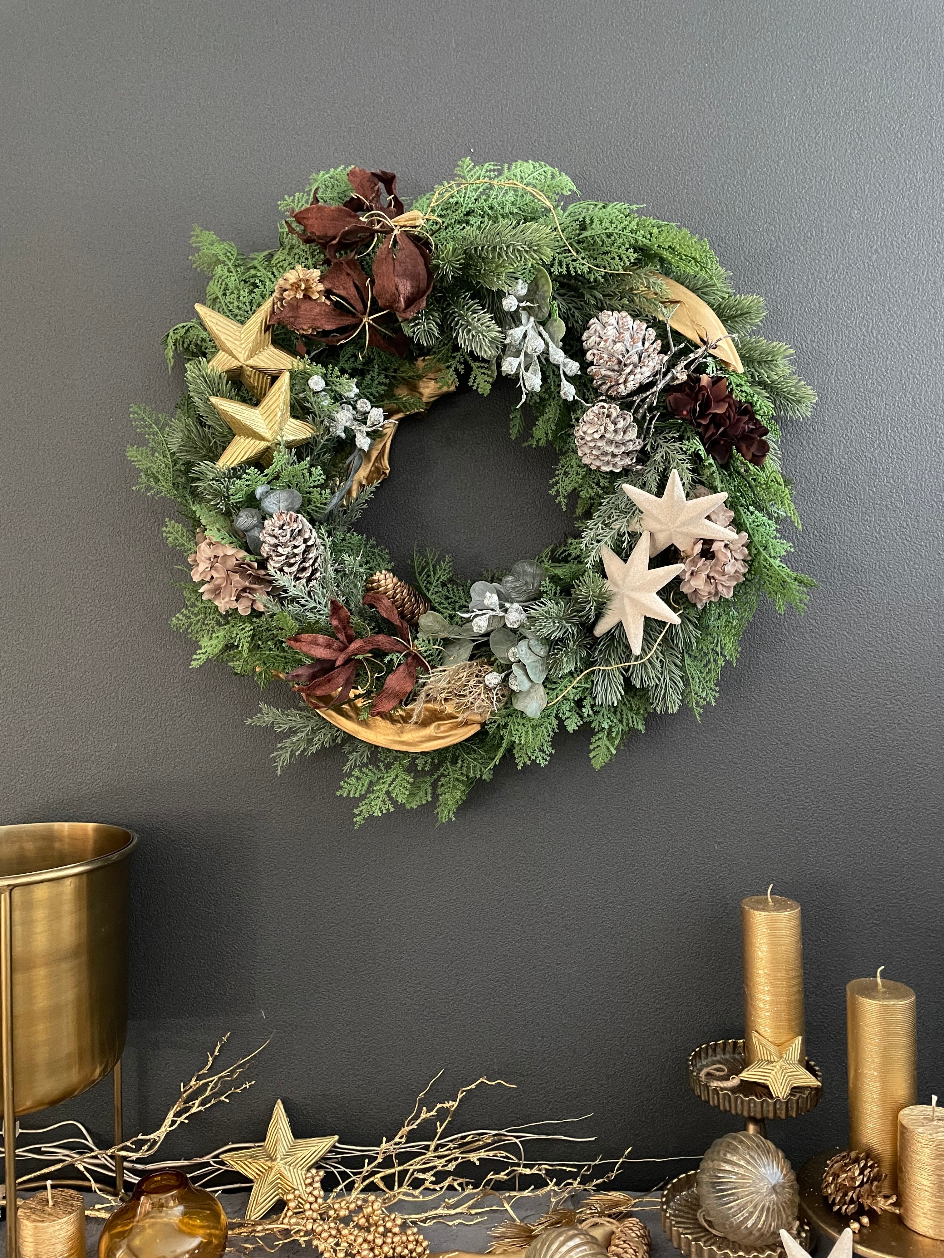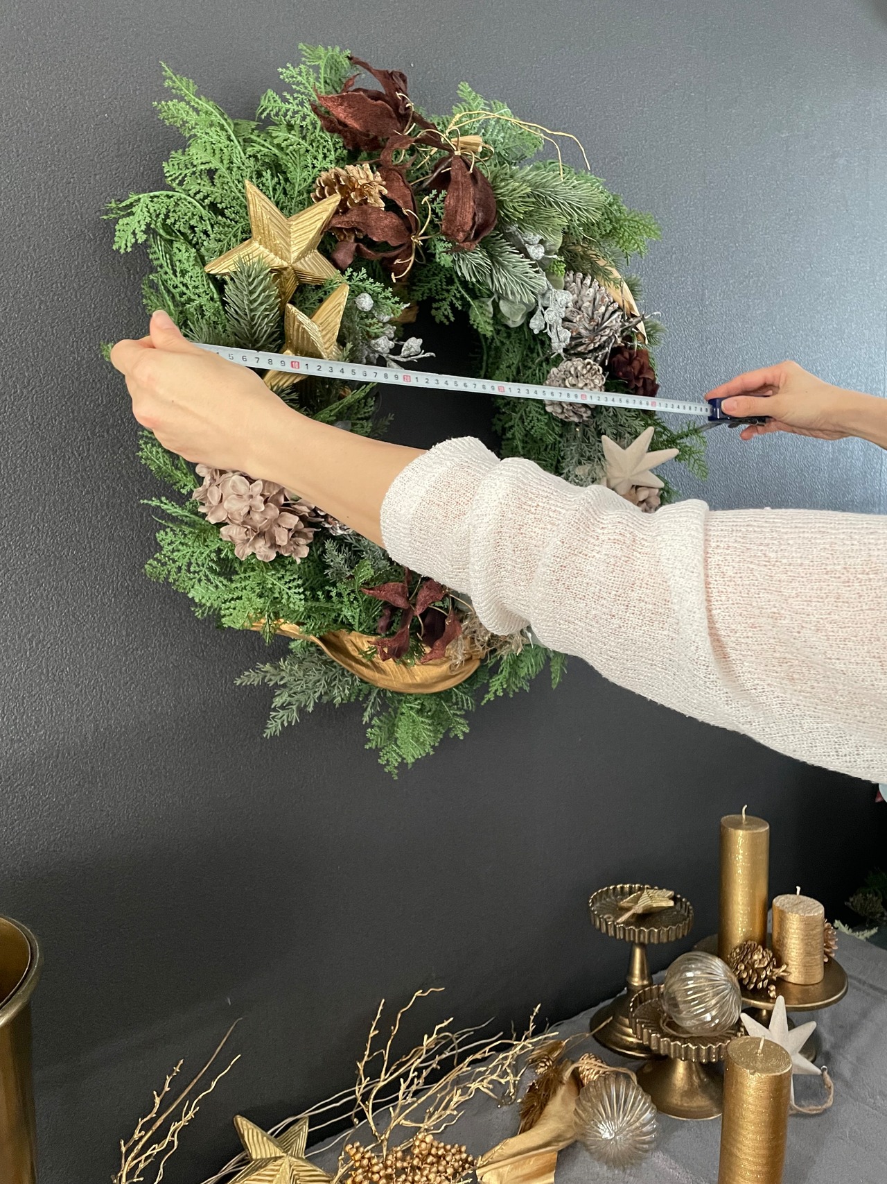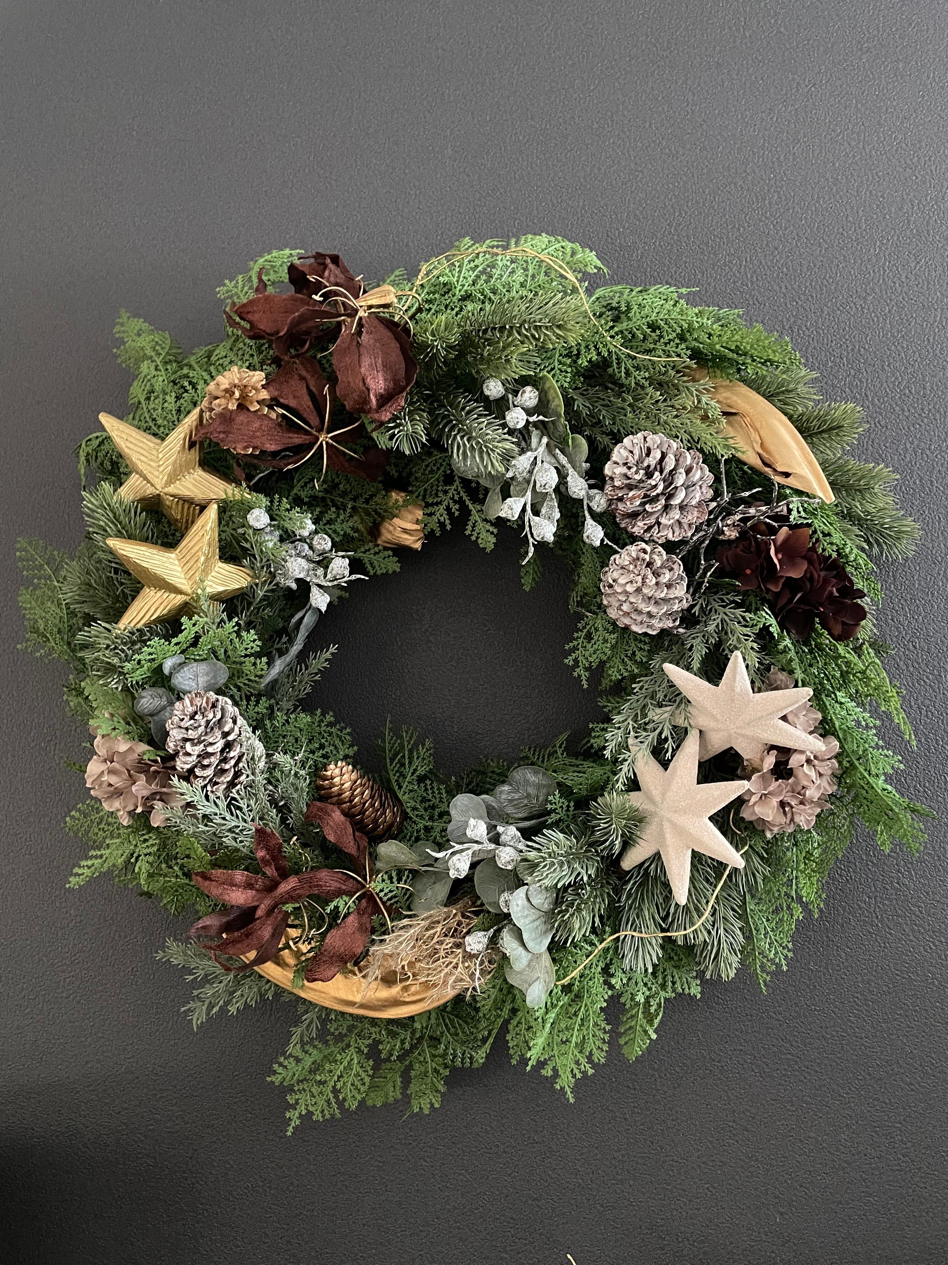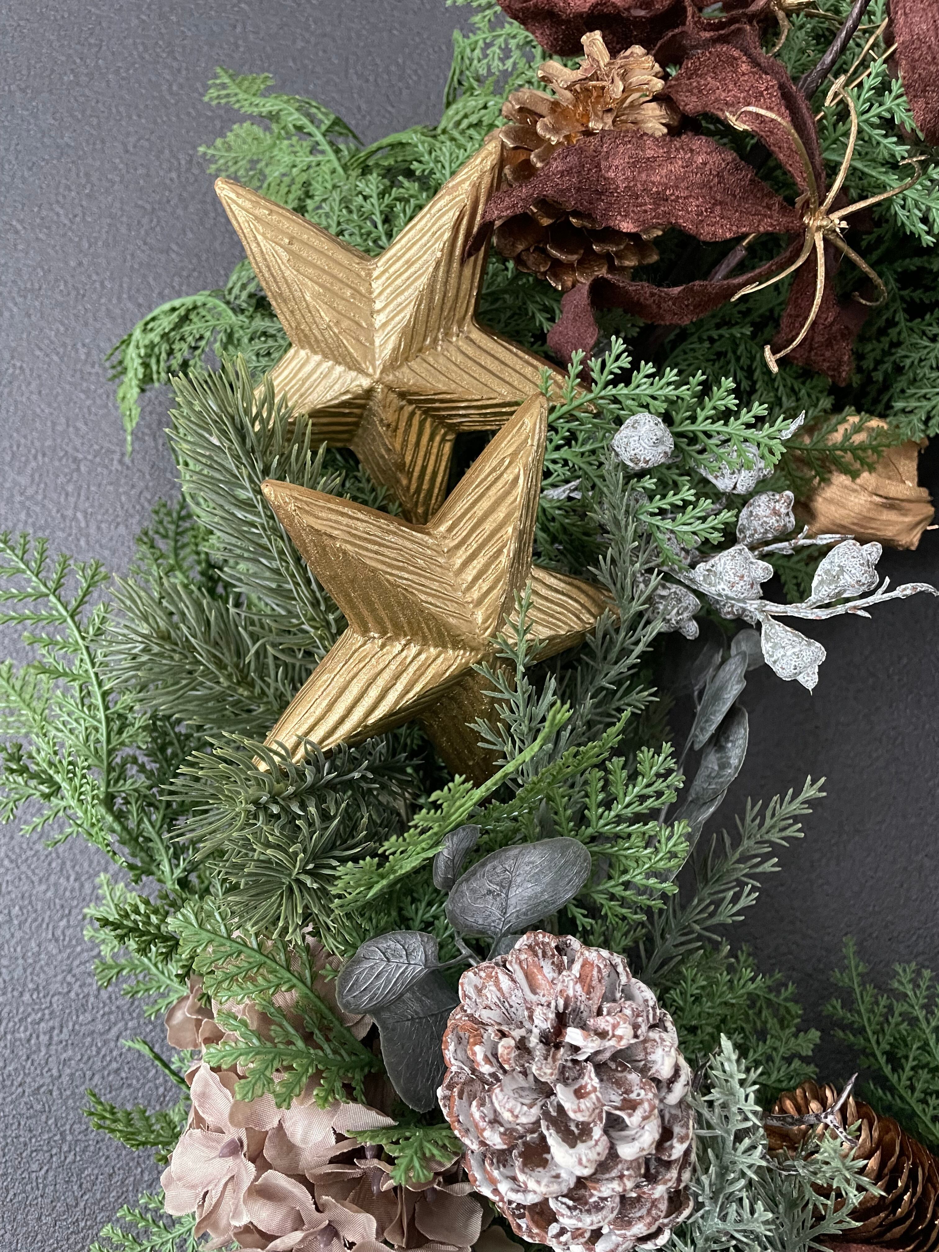 ブラウンをアクセントにしたシックな色合いの中に、上品なマットゴールドが華やかさを添えています。眺めるたびに魅力が増す、飽きのこないリースです。