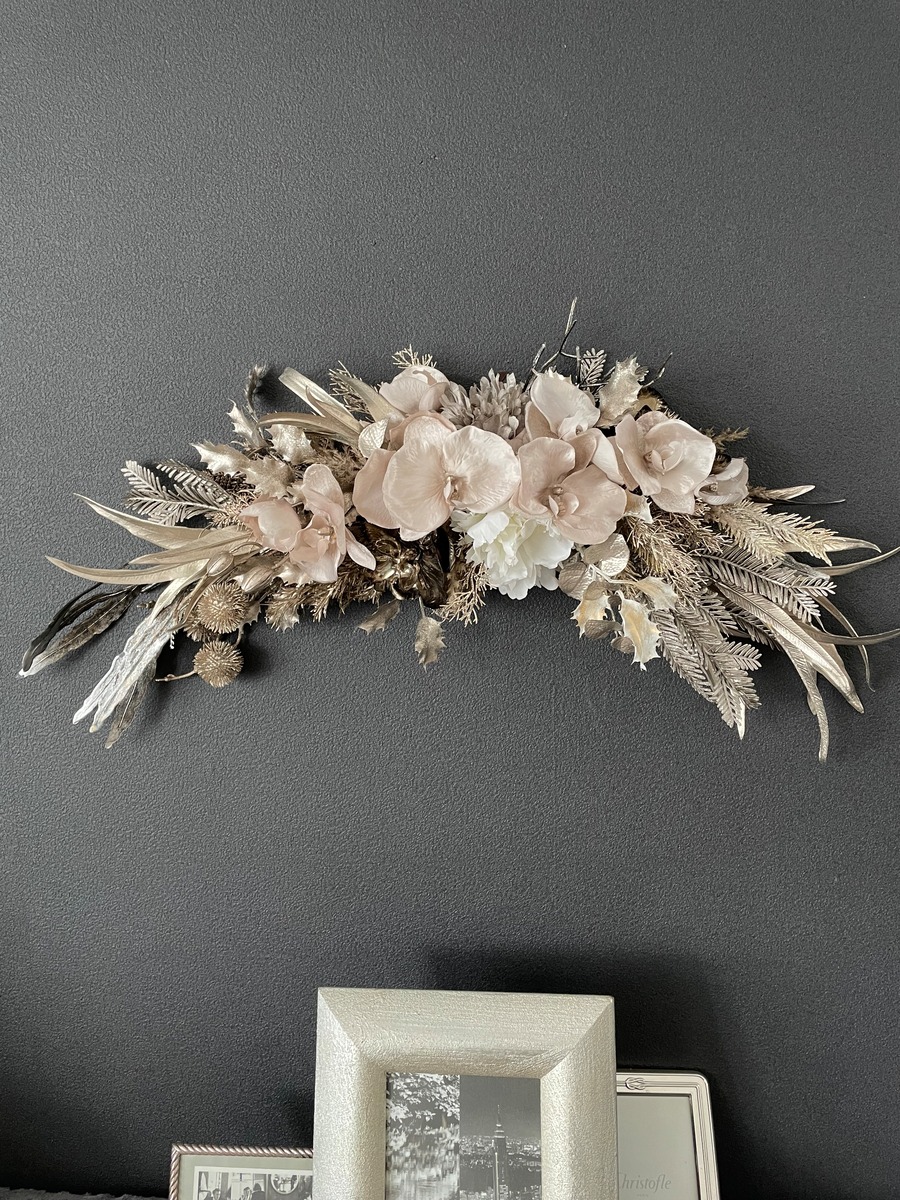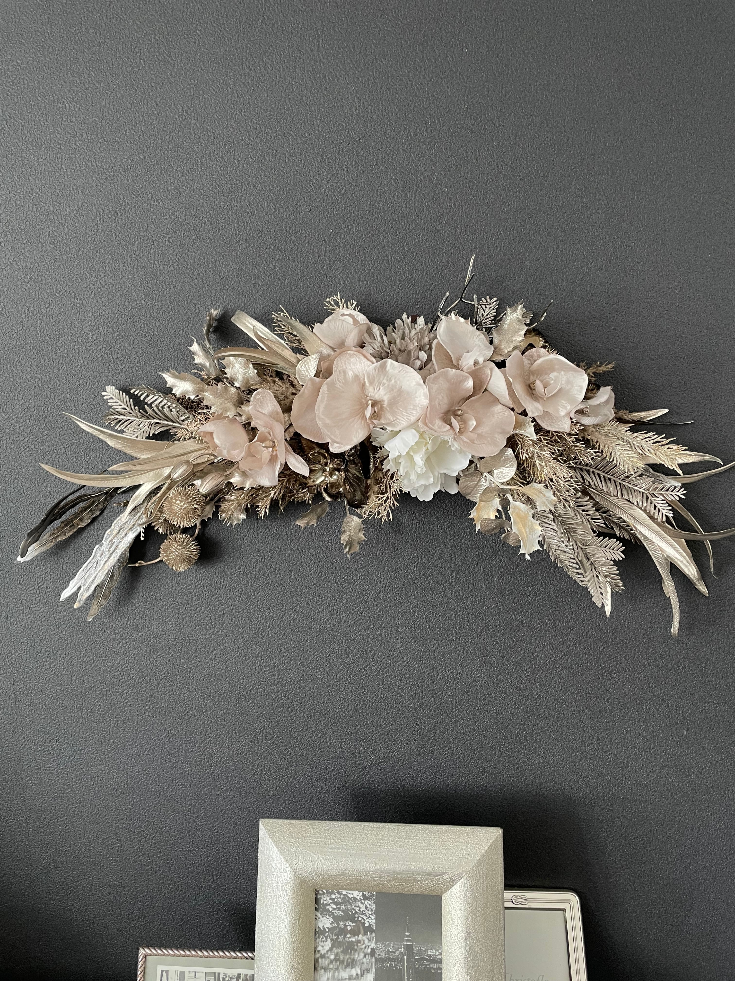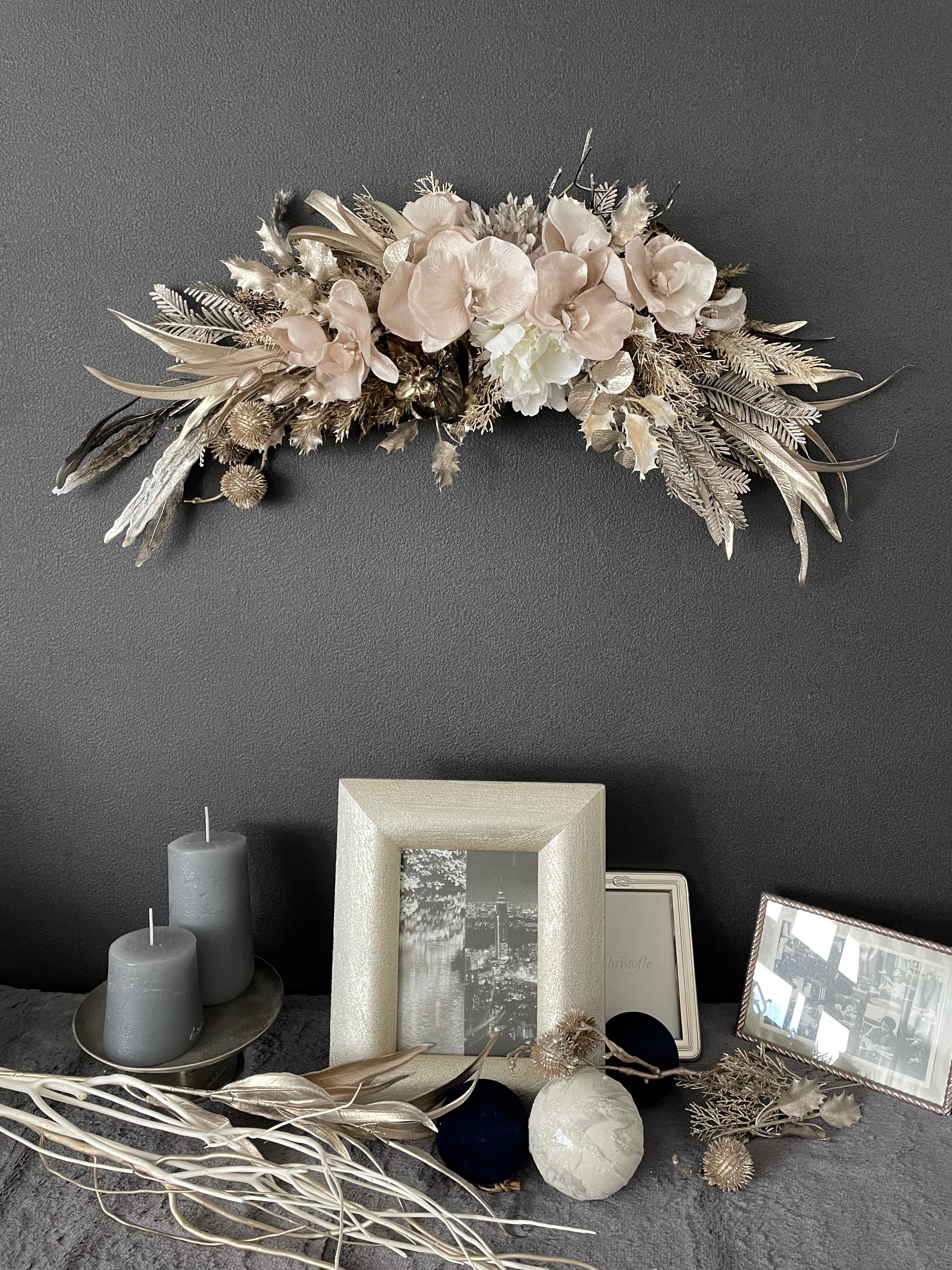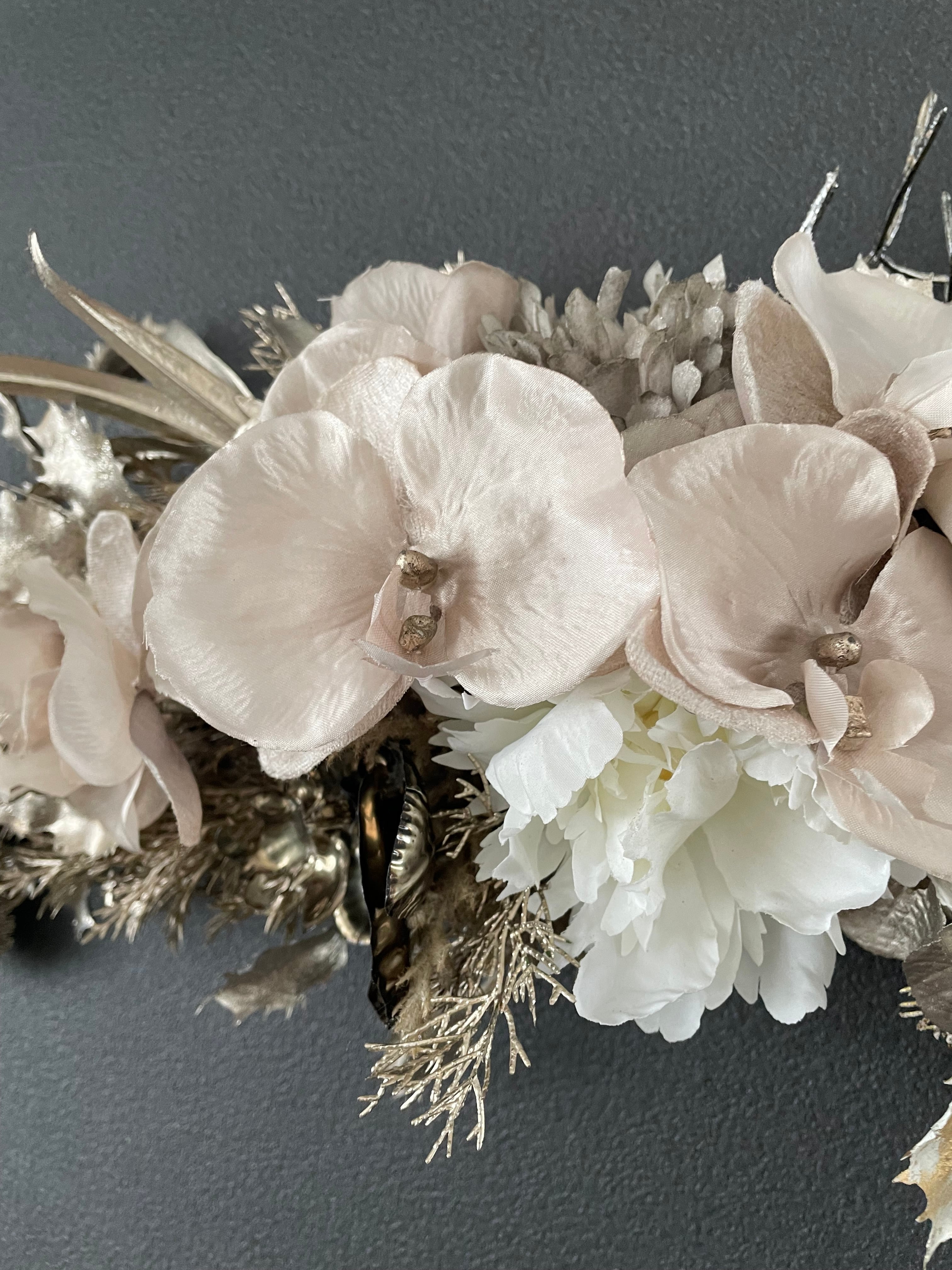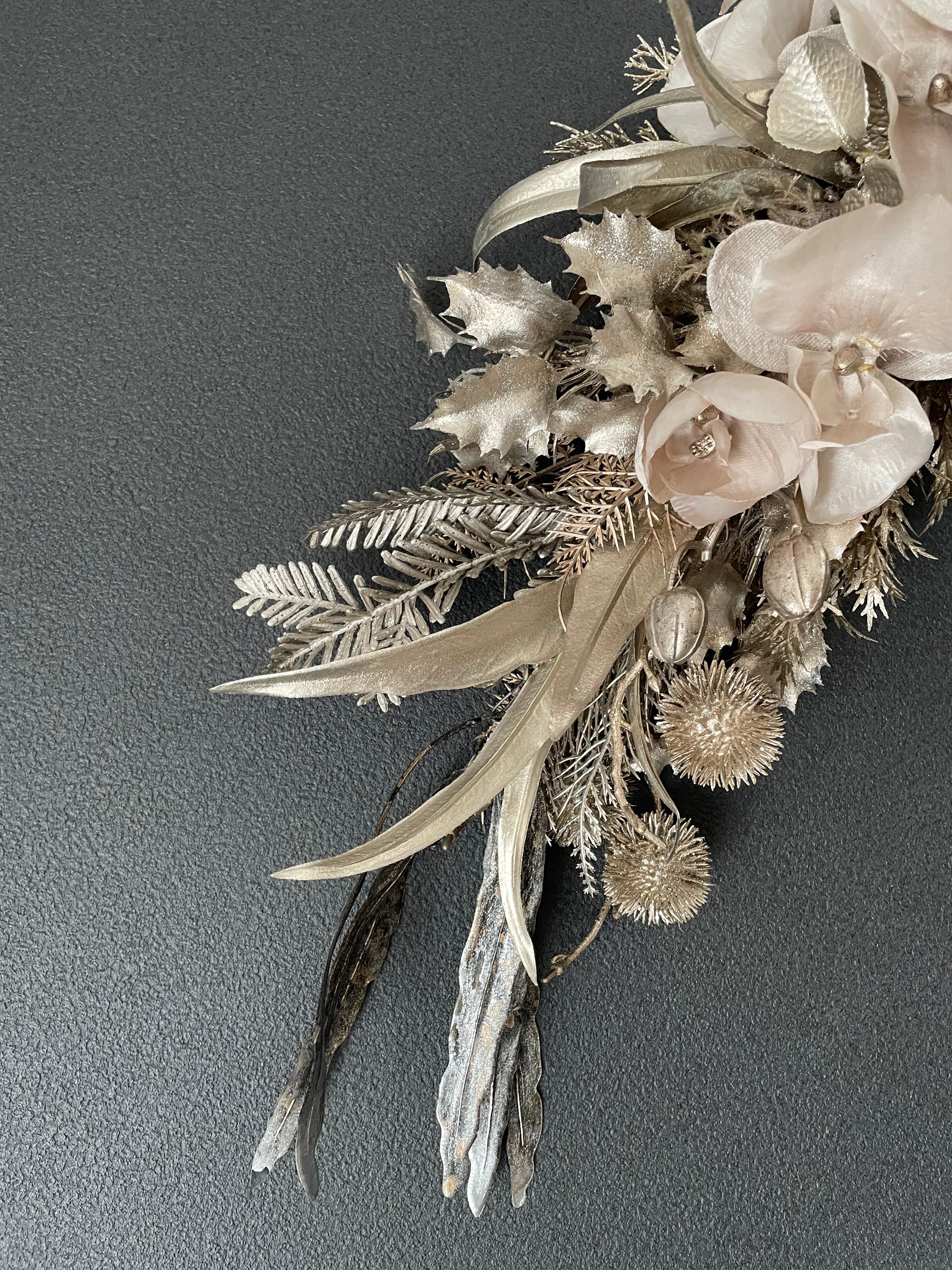 マットシルバー、シャンパングレー、ブロンズ、ガンメタルなど、落ち着いた気品ある輝きのリーフを集め丁寧に紡いだスワッグです。