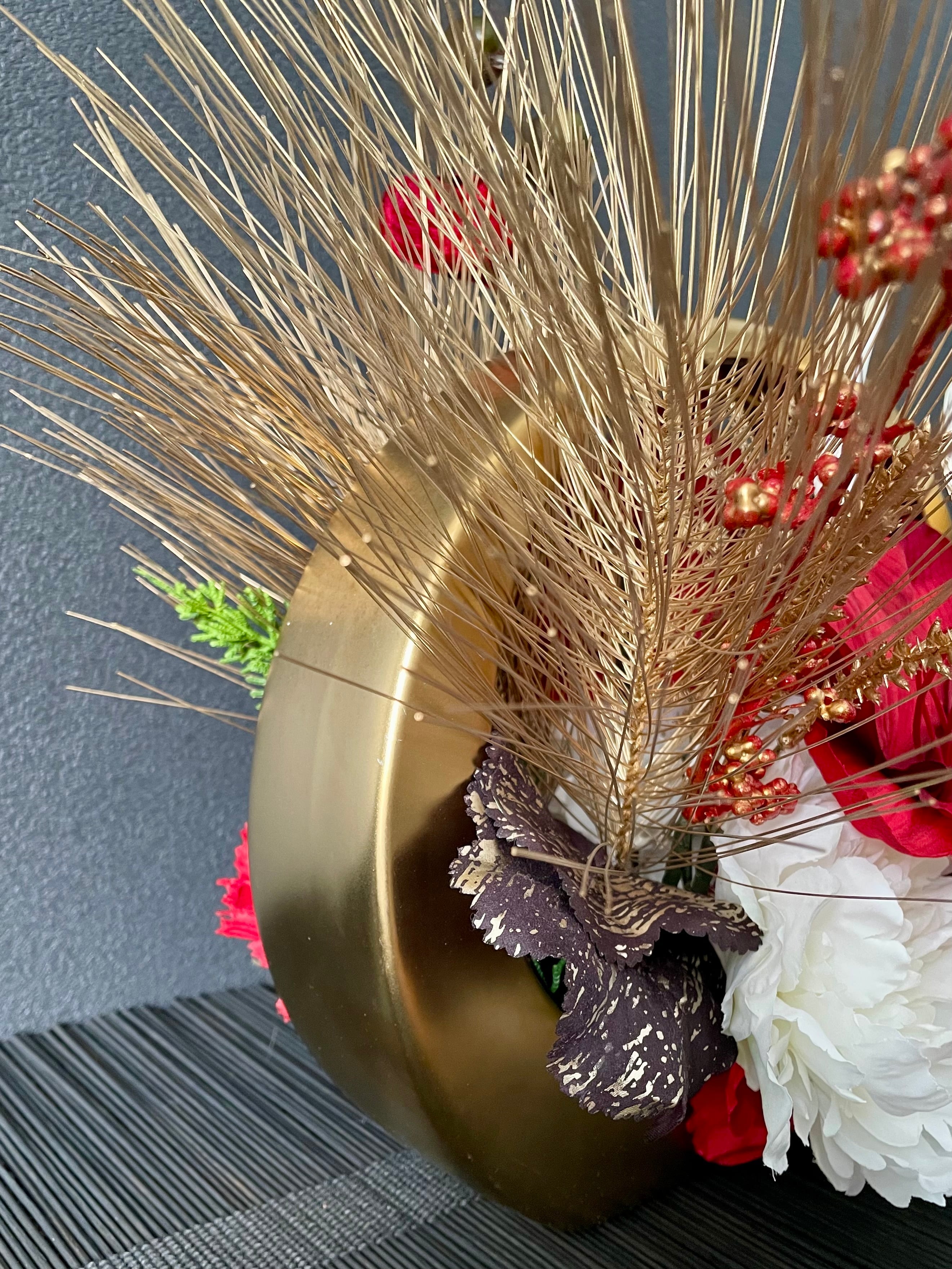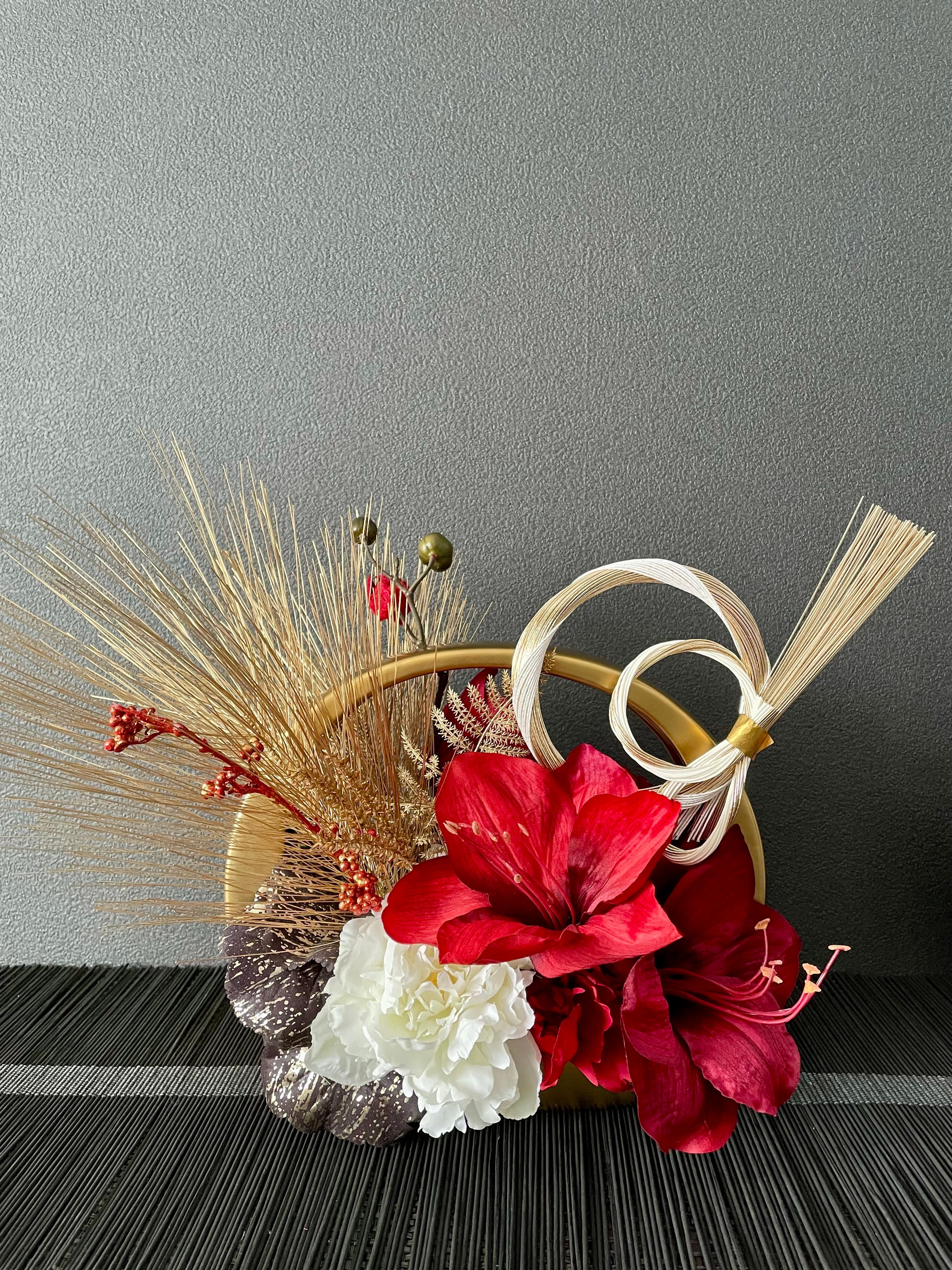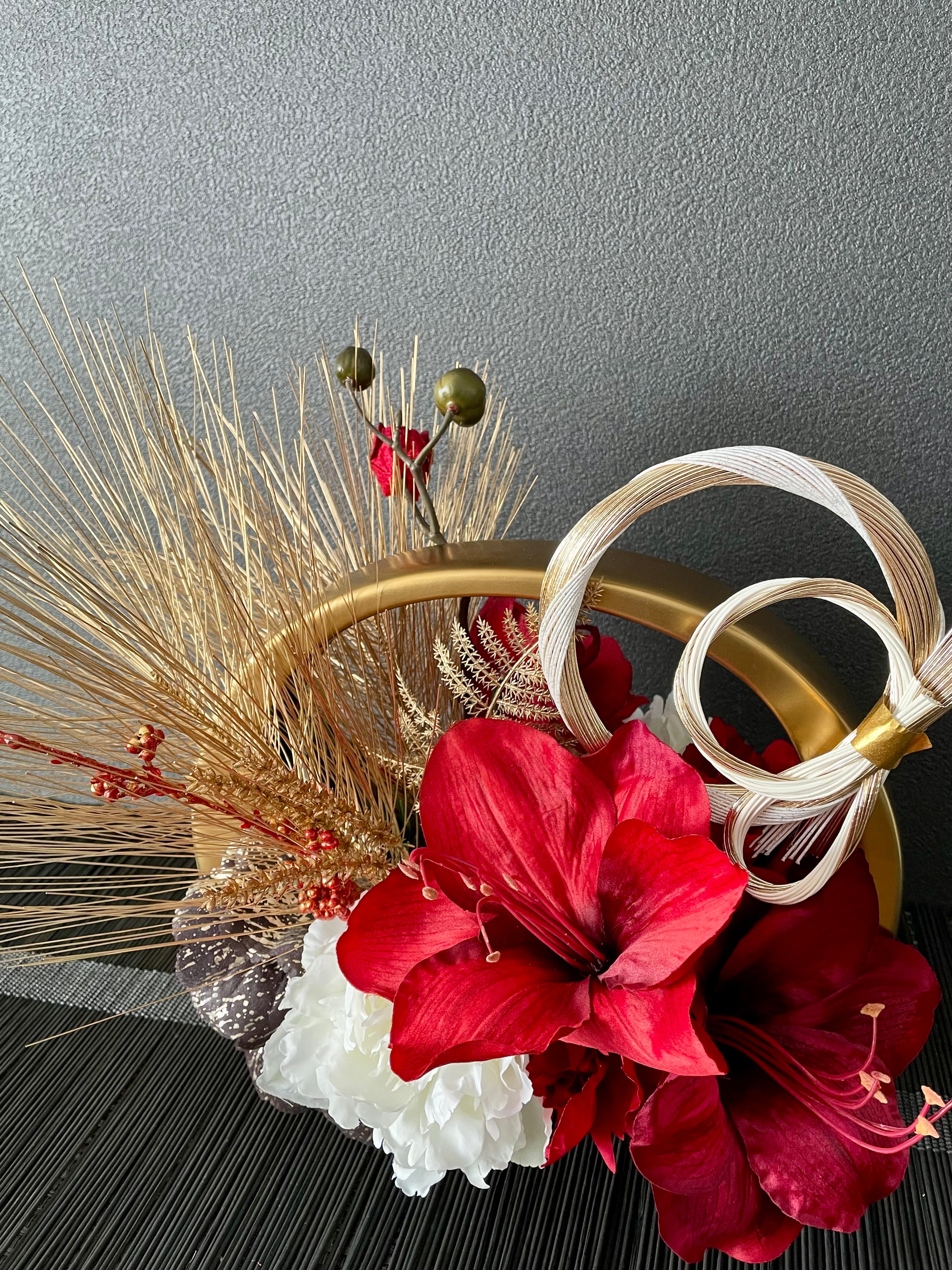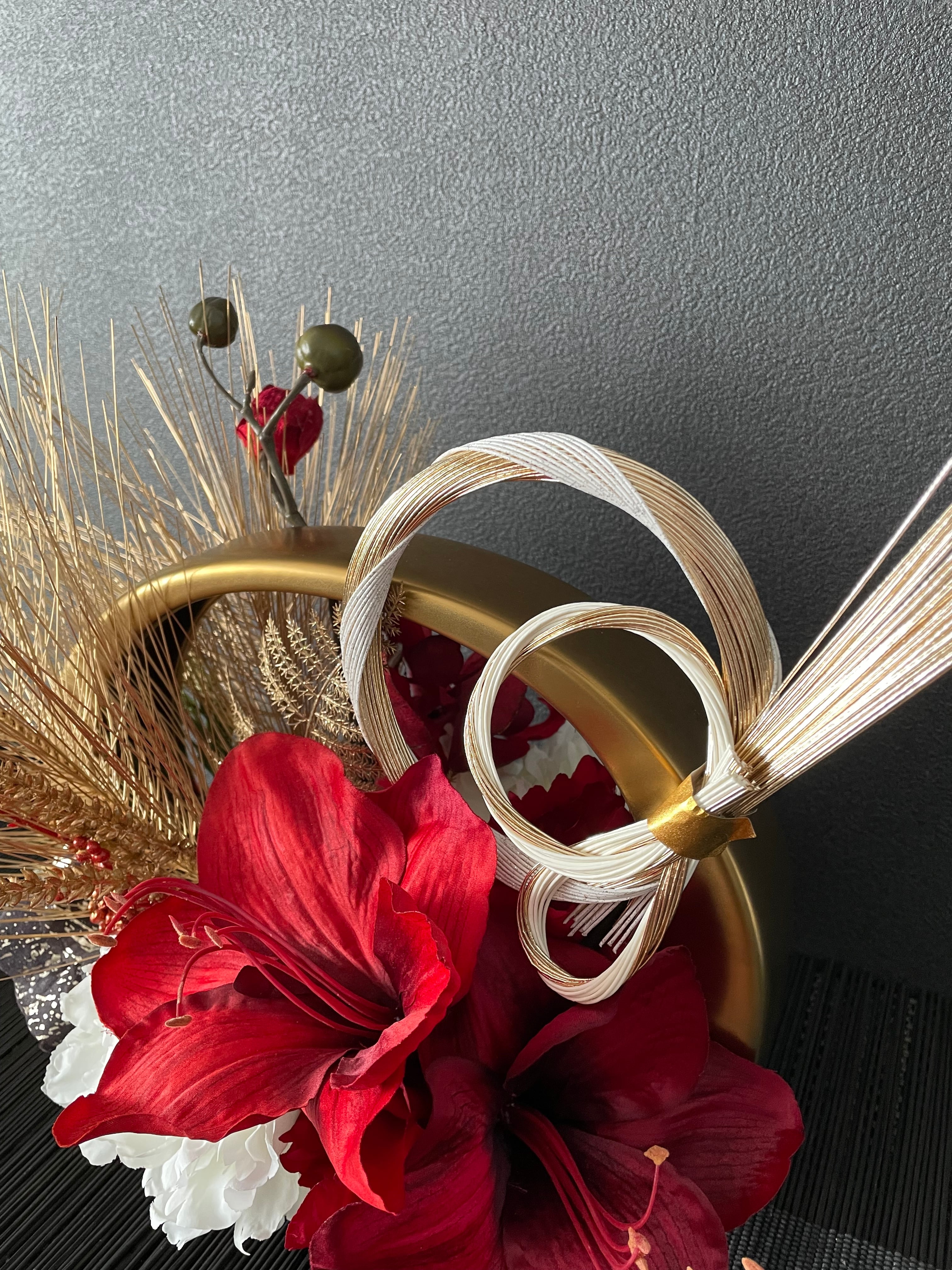美しい流線型の輪を描く、珍しいデザインの陶器に紅白のお花をコーディネートしました。上品な輝きのマットゴールドの器に、華やかながら気品のある赤色のアマリリス、清々しい白のシャクヤク、ゴールドの松などを合わせました。
