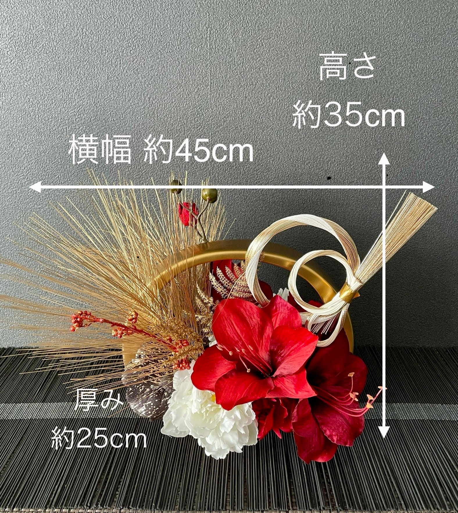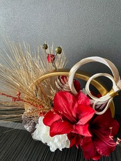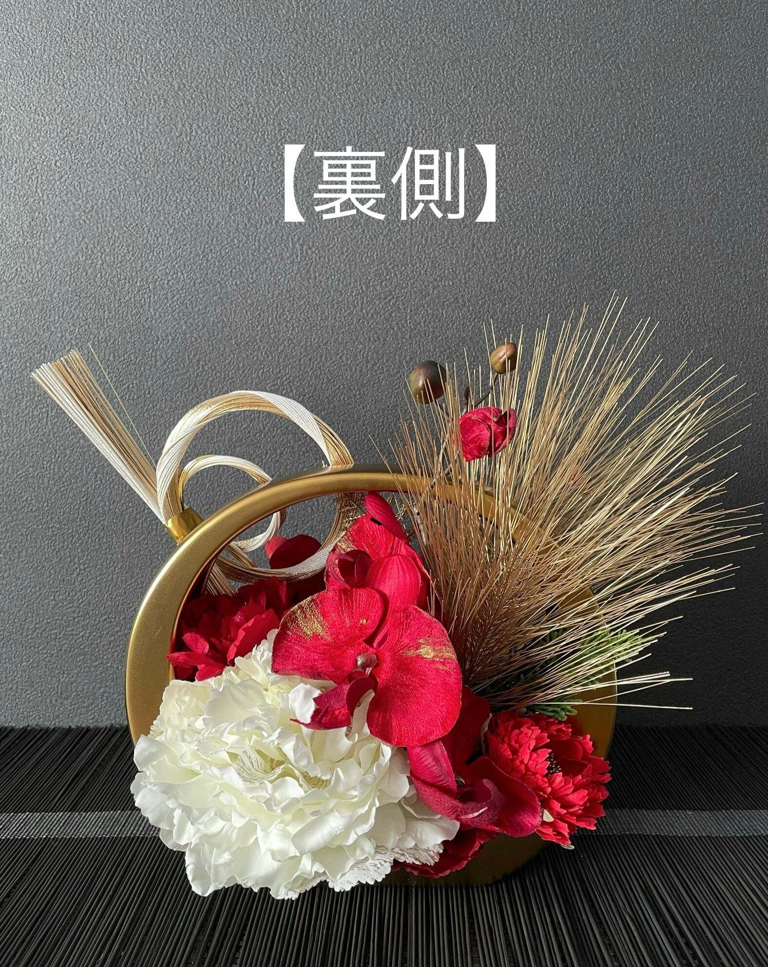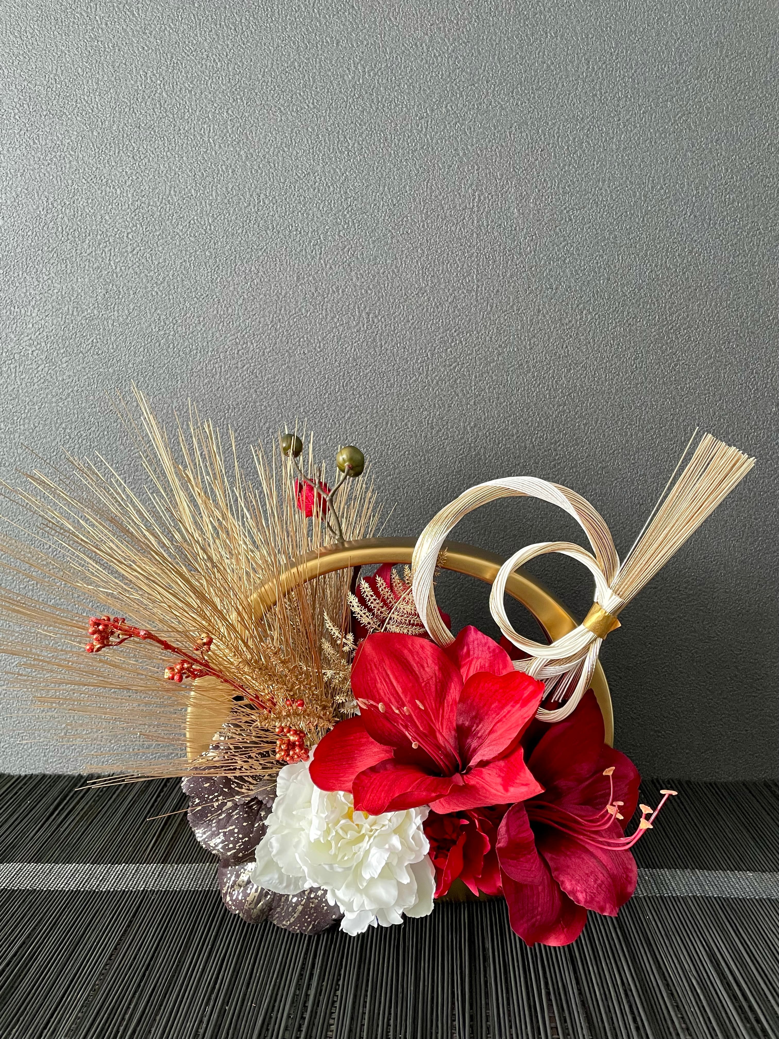 新春を祝うに相応しい、気品あふれる洗練されたデザインのアーティフィシャルフラワーのお正月飾りです。