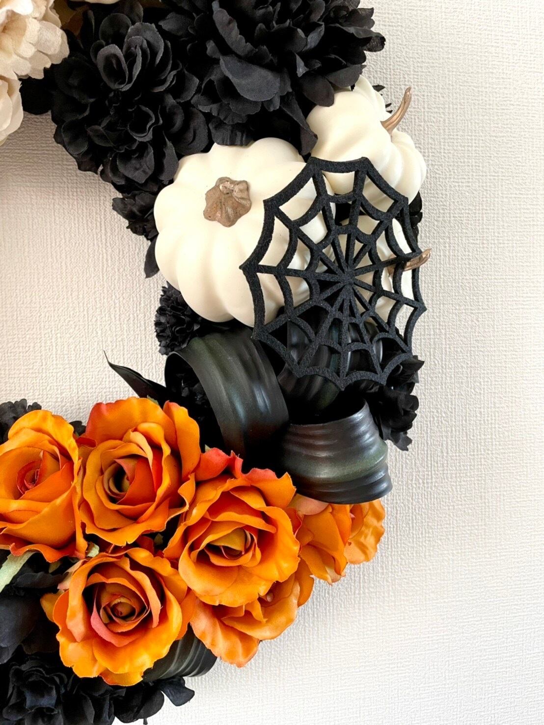 ハロウィン仕様ですが、シックで落ち着いた色合いで、大人っぽく、お部屋にもなじみやすいリースで、ハロウィンパーティーや玄関飾りなど、おしゃれなハロウィンを演出できます。