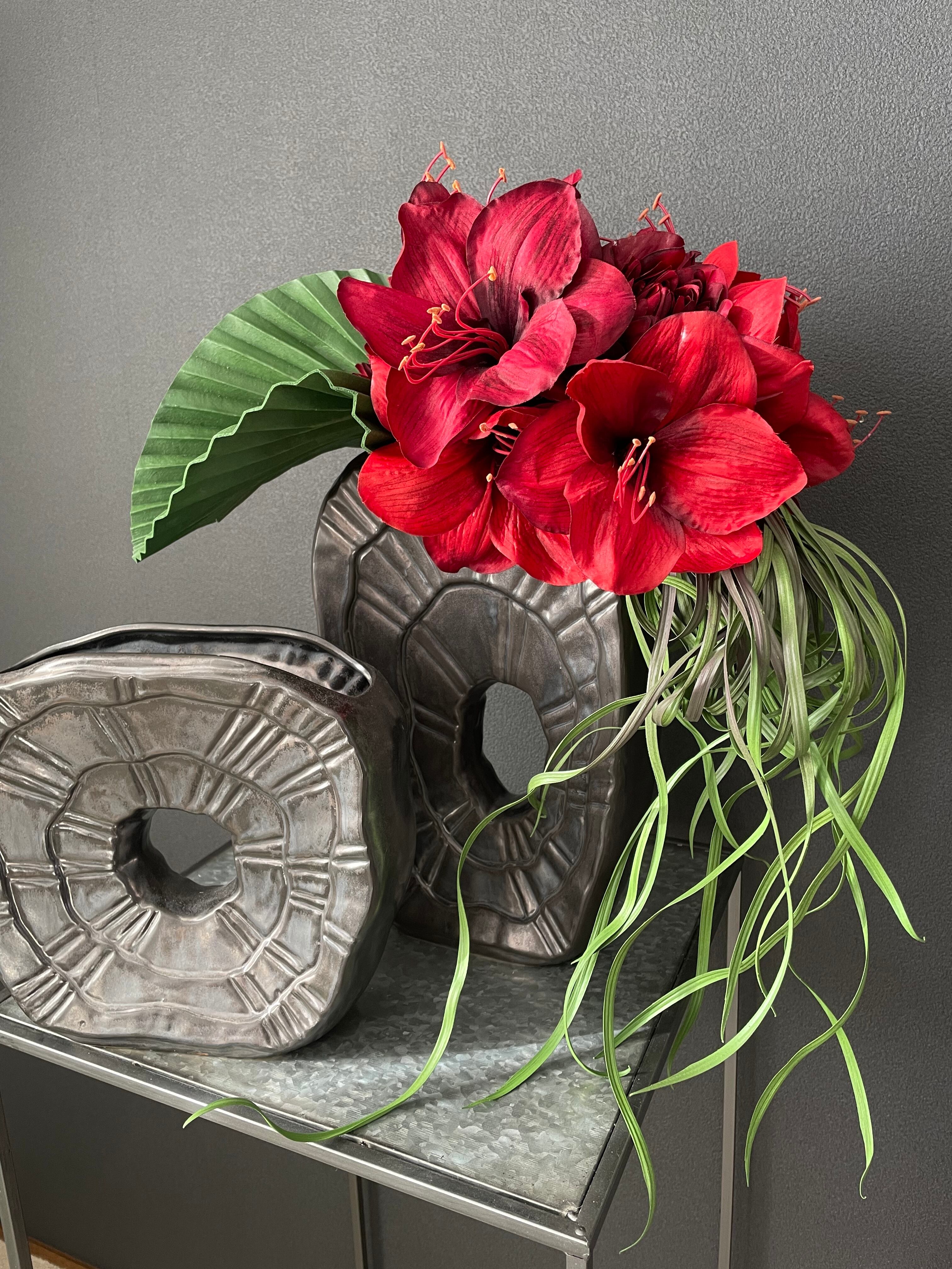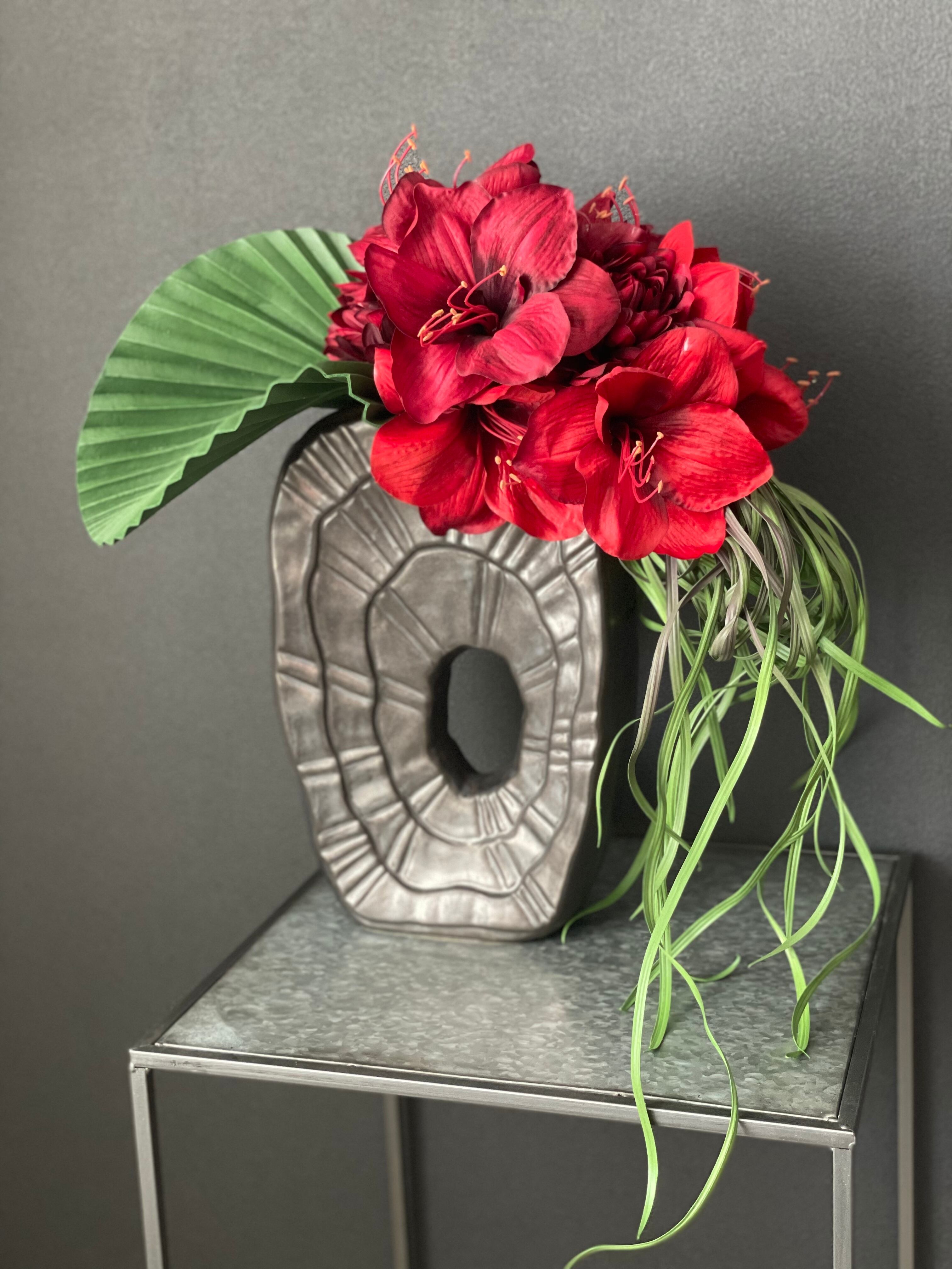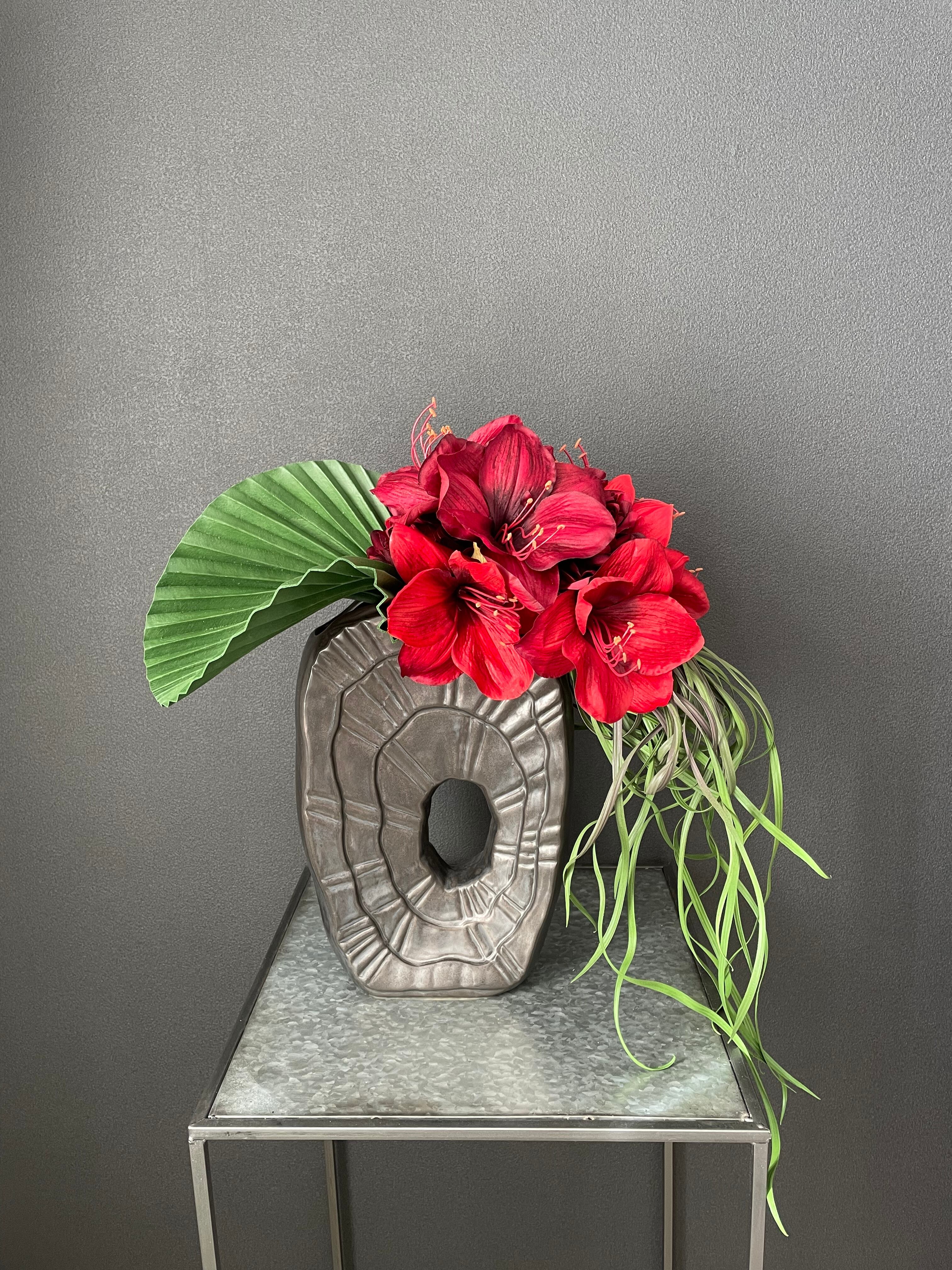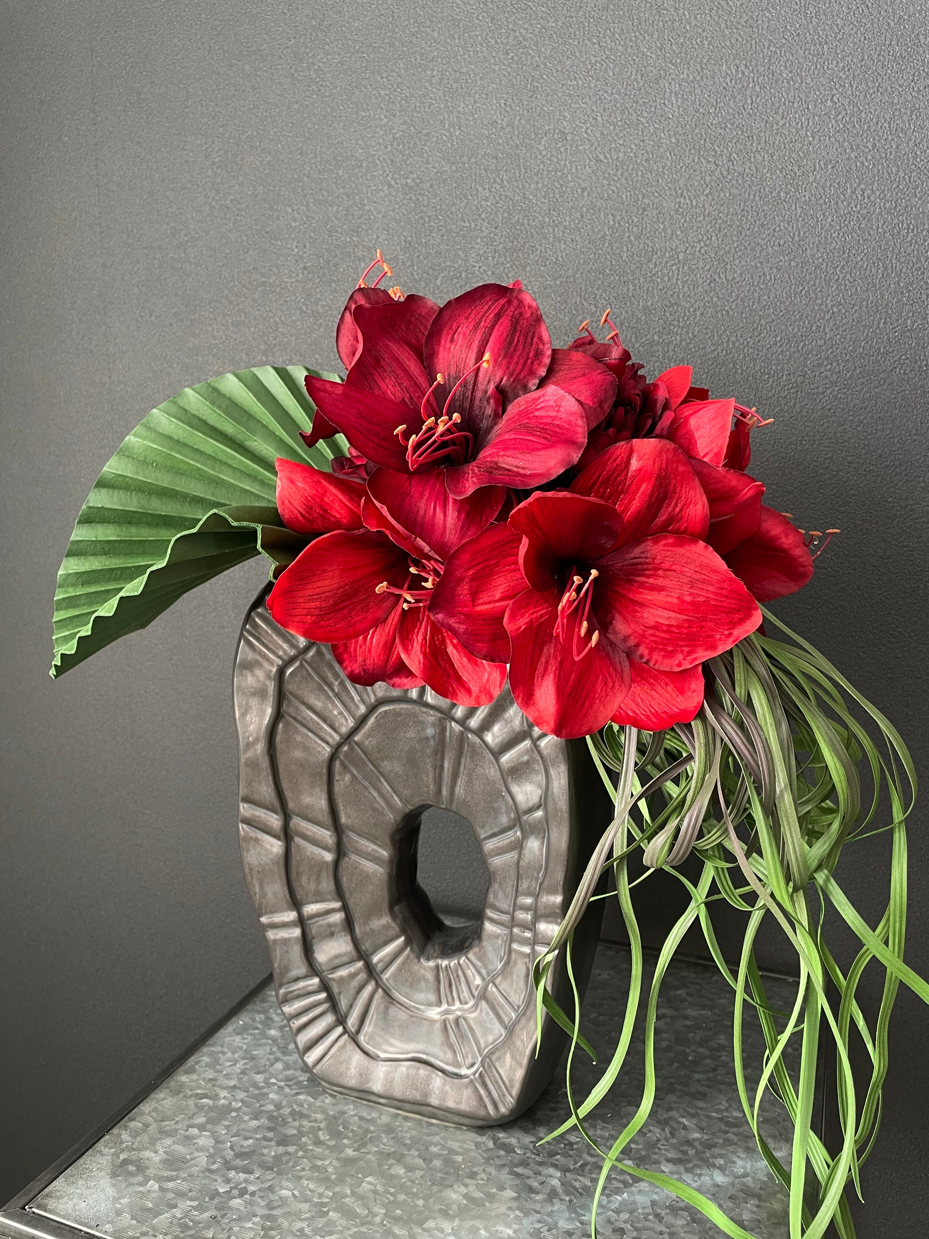 個性的な花器に美しい真紅のアマリリスが映えるモダンなアレンジメント