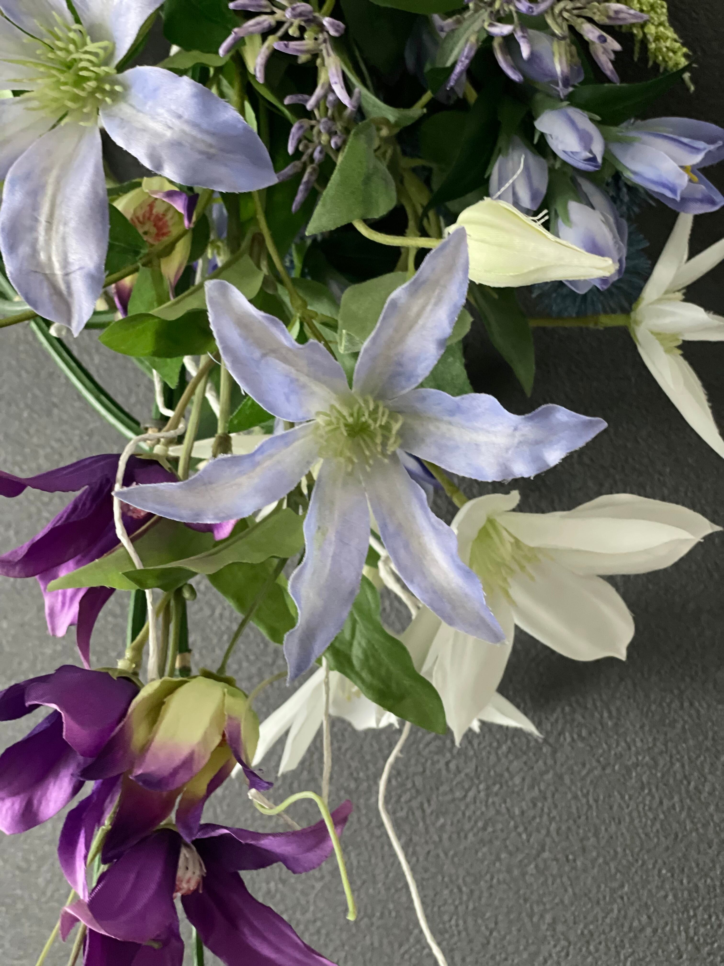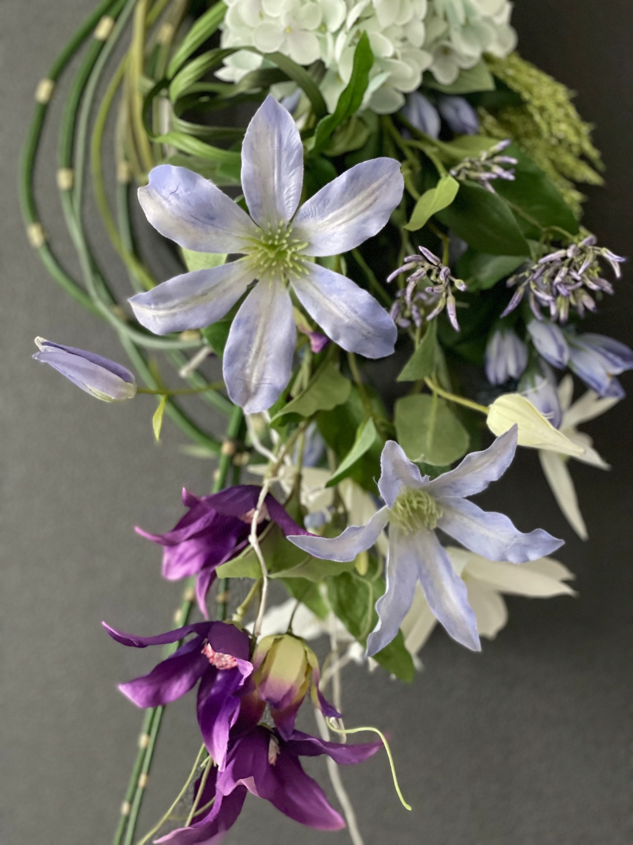 気品溢れる紫、涼やかな藤色、清楚な白、3色のクレマチスに、トクサなどの個性的なグリーンと合わせてコーディネートしました。