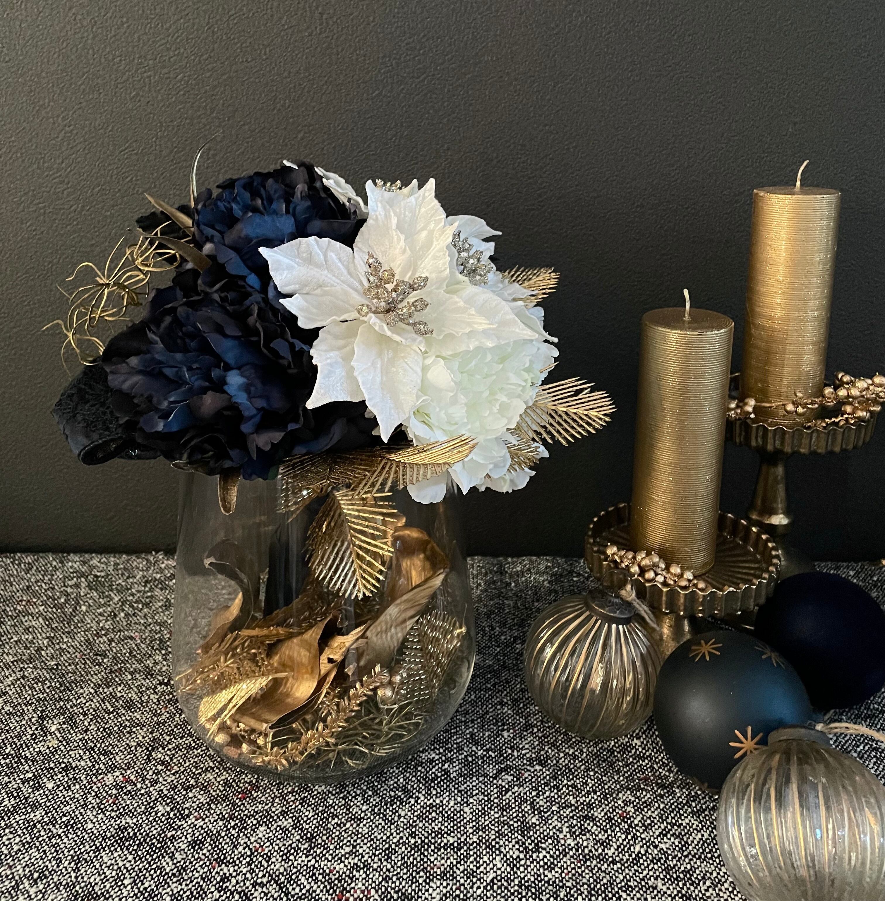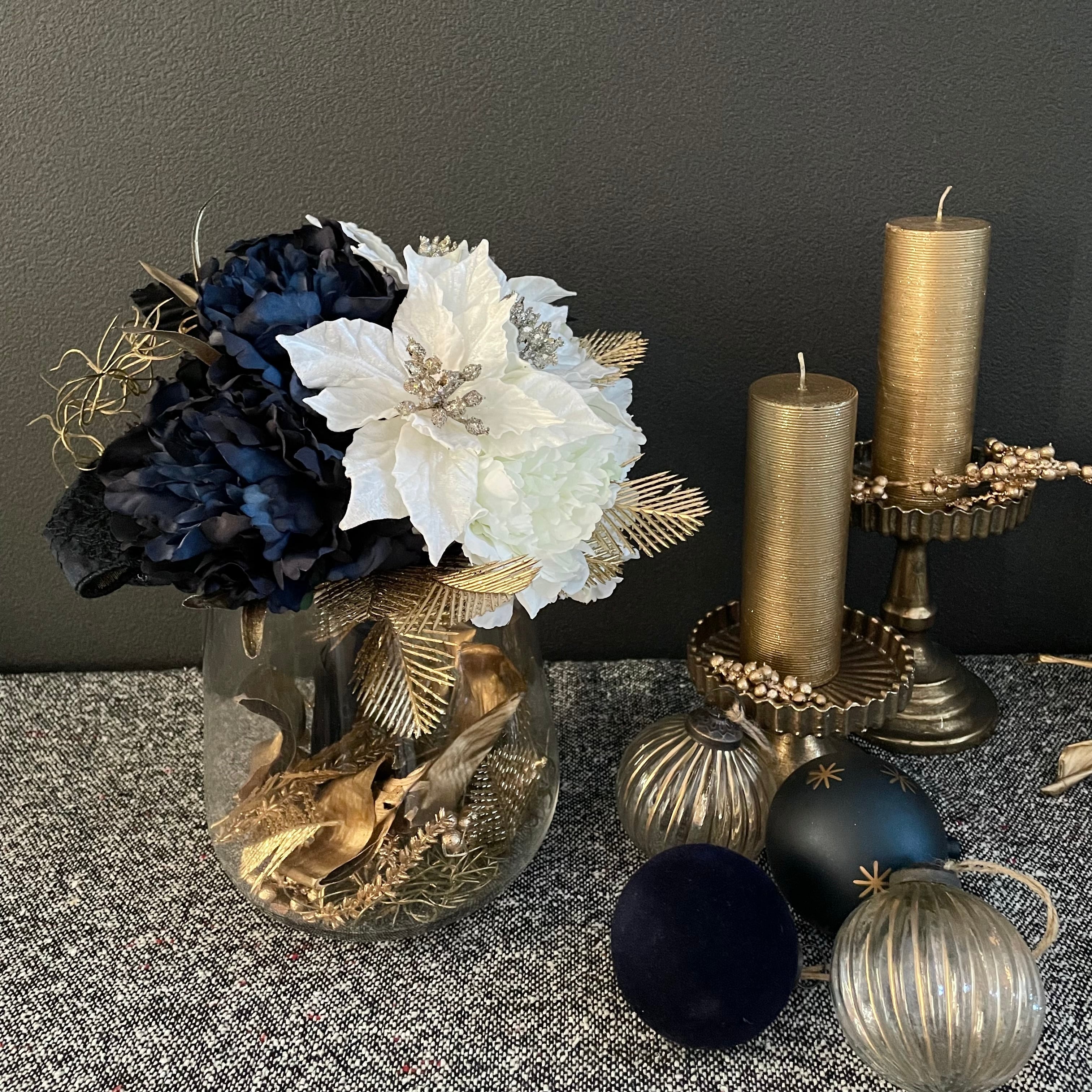 ネイビー&ホワイトに、落ち着いたゴールドを添えたシックでゴージャスなコーディネートです。大人のクリスマスをイメージしました。ガラスのフラワーベースの中には、上品なゴールドのリーフや実物をあしらった、目にも楽しいアレンジメントです。