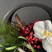輪を描くデザインの漆黒の陶器に、美しい紅の菊に純白の胡蝶蘭をあしらい、美しい流線型を描く緑を添えた迎春のアレンジメントです。