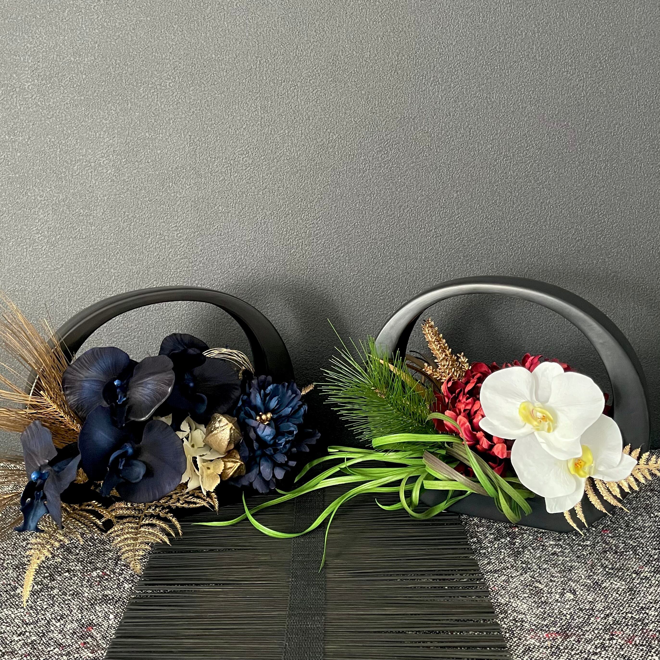 寿ぎの輪の陶器アレンジメント2点セット【紅白&濃紺の寿ぎアレンジメント】